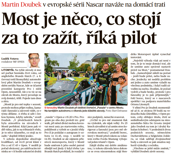 Na tyhle závody si musel počkat bezmála čtvrt roku, od anglického Brands Hatch (7. a 8. června) totiž litomyšlský automobilový pilot Martin Doubek v evropském seriálu Nascar, kde se účastní prestižní kategorie Pro i nižší Open, nesoutěžil. Ale o to víc se na okruh do Mostu, který považuje za svůj domácí, těšil. Pojede tam dnes a zítra.
